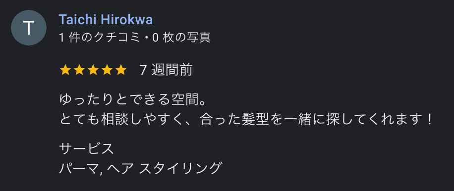 30代 会社員 K.Tさん 「普段美容院でオーダーする時よりも、より深くまでヒアリングして頂けて思いが伝えやすかった。誰にどういった印象を持たれたいか?という抽象的な理想から相談出来たので、なりたいイメージ像の擦り合わせがしやすくて良かった」