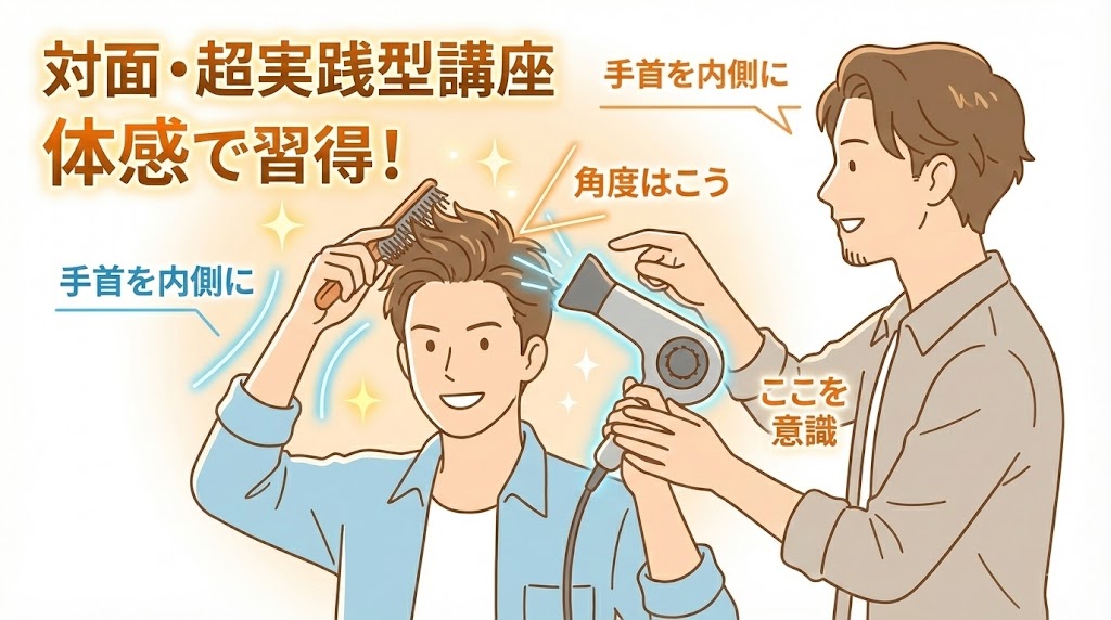 - リアルタイムで細かいフィードバック 「もう少し手首を内側に」「ドライヤーの角度をこう」など、その場で修正